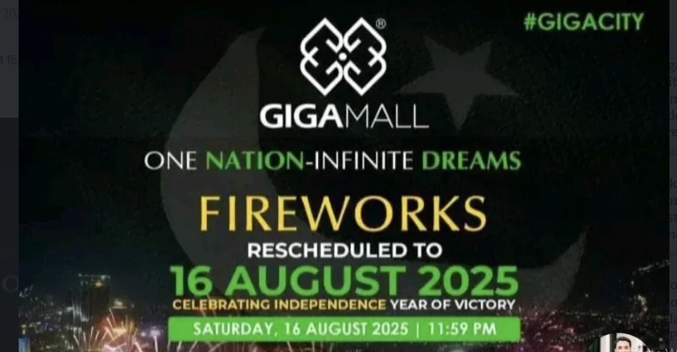 گیگا گروپ کو پاکستان کے یوم آزادی کے جشن کے لیے دو الگ الگ دنوں میں آتش بازی منسوخ کرنے پر تنقید کا سامنا ہے۔ سینکڑوں شہریوں، جن میں خاندان بھی شامل تھے، نے گیگا مال کے سامنے دونوں دنوں میں گیگا گروپ کی جانب سے اعلان کردہ آتش بازی کے شو کی توقع میں جمع ہوئے تھے۔ منسوخی کے نتیجے میں شرکاء میں نمایاں مایوسی پیدا ہوئی۔
